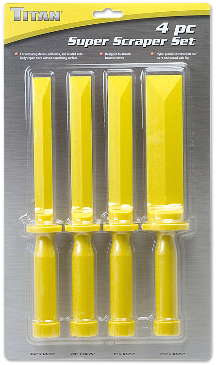 - Includes 4 scrapers, 3/4", 7/8", 1" & 1-1/2" x 10-3/4" length